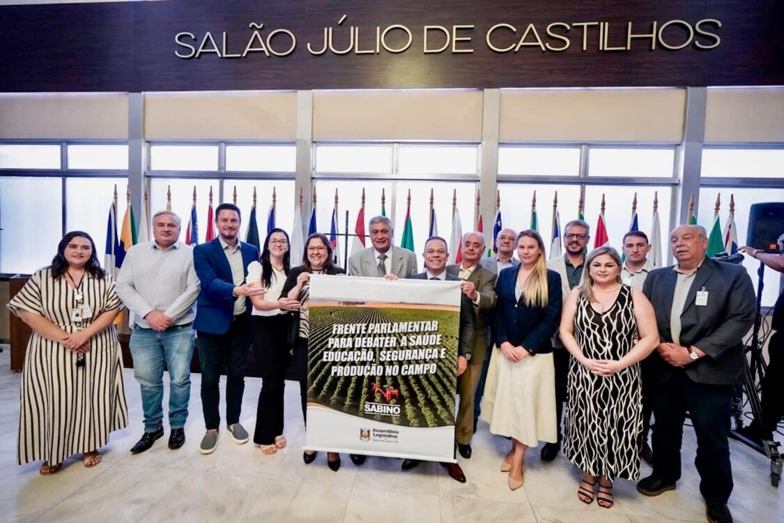 Nesta quarta-feira, 21 de fevereiro, a Assembleia Legislativa do RS instalou a Frente Parlamentar para Debater a Saúde, Educação, Segurança e Produção no Campo. A iniciativa foi proposta pelo deputado estadual Sabino, que assume, a partir de agora, a presidência da Frente Parlamentar. Segundo o proponente, o objetivo do grupo de trabalho é atuar diretamente no debate sobre a implementação de políticas públicas relacionadas à saúde, educação, segurança e produção no campo, proporcionando ainda debate e ações estratégicas. “Estamos comprometidos em abordar e debater questões vitais para o desenvolvimento e a qualidade de vida no campo, compreendendo que isso vai além da atividade produtiva, precisamos abordar as diversas dimensões que afetam a vida das famílias que residem e atuam nas áreas rurais do nosso Estado,” destacou o presidente Sabino. Além disso, o parlamentar ressaltou que a Frente Parlamentar visa debater diversos temas, entre eles: a saúde no campo, relacionada ao bem-estar físico, mental e social das pessoas que vivem e trabalham nas áreas rurais; o acesso a serviços de saúde e a alimentação adequada; o acesso a educação de qualidade, ao transporte escolar e o fomento ao ensino agrícola; a regularização das atividades agropecuárias, além da proteção contra o abigeato e a garantia de segurança econômica para os produtores. “Portanto, o objetivo principal desta Frente Parlamentar é promover o debate e buscar soluções efetivas para as questões que afetam diretamente a vida no campo,” finalizou Sabino. O diretor financeiro da Federação da Agricultura do RS – Farsul, José de Alcindo de Souza Ávila, destacou em seu discurso o importante trabalho realizado no Brasil, na área da produção. “Para mim é muito fácil falar sobre, porque há anos sou produtor rural e estou há anos na Farsul, e venho acompanhando a evolução e mostrando às pessoas qual é a capacidade de produção do homem do campo. Contem conosco, para sermos parceiros nesse trabalho. Sucesso para a Frente Parlamentar!”. O vice-presidente da Federação das Associações de Municípios do Rio Grande do Sul – Famurs, prefeito de Barra do Rio Azul Marcelo Arruda, destacou em sua fala a evolução do trabalho agrícola. “Trazer, em nome da Famurs, que representa as 497 cidades, o nosso agradecimento e reconhecimento por essa importante Frente Parlamentar, que vai debater um tema que movimenta e que está no DNA do Rio Grande do Sul, o agronegócio. No passado tivemos uma agricultura de muito trabalho e muita dificuldade, mas graças a atuação dos poderes públicos nós viramos essa chave e o nosso Estado vive um novo momento, onde o agronegócio vem se desenvolvendo, pela parceria do Governo Estadual, da Assembleia Legislativa e dos Municípios.” Estiveram presentes: vice-presidente da Câmara de Vereadores de Porto Alegre, vereadora Tanise Sabino; diretora do Departamento de Atenção Primária e Políticas de Saúde da Secretaria de Saúde, Tatiane Pires Bernardes; coordenadora da Área Técnica de Saúde da População do Campo, Floresta e Águas, Rafaela da Vitória; chefe da Divisão da Educação de Jovens e Adultos da Subsecretaria de Desenvolvimento da Educação, Profª Claudia Feijó da Silva Fraga; diretor financeiro da Federação da Agricultura do RS – Farsul, José de Alcindo de Souza Ávila; vice-presidente Desireé Möller e diretor executivo Fernando Azambuja e da Federação Brasileira das Associações de Criadores de Animais de Raça – Febrac; vice-presidente da Federação das Associações de Municípios do Rio Grande do Sul – Famurs, prefeito de Barra do Rio Azul Marcelo Arruda; secretária geral da Federação dos Trabalhadores na Agricultura no Rio Grande do Sul – Fetag, Jaciara Muller; diretor executivo da Associação Gaúcha de Empresas Florestais – Ageflor, Jorge Heineken; representando o Sindicato Rural de São Francisco de Paula, Rafael Marques; representando o Sindifisco, José Eduardo Jasnievicz.