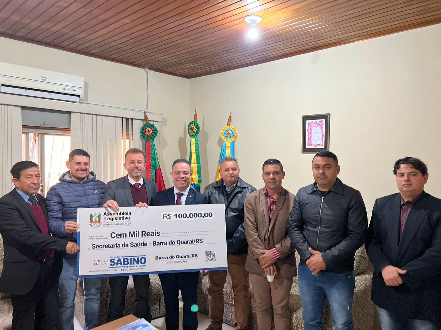Nesta quinta-feira, 15 de junho, o deputado estadual Sabino oficializou a entrega de Emenda Parlamentar, de sua autoria, para a cidade da Barra do Quaraí. O recurso, no valor de R$ 100.000,00 (cem mil reais), já está disponível na conta da Prefeitura para ser utilizado na área da saúde.