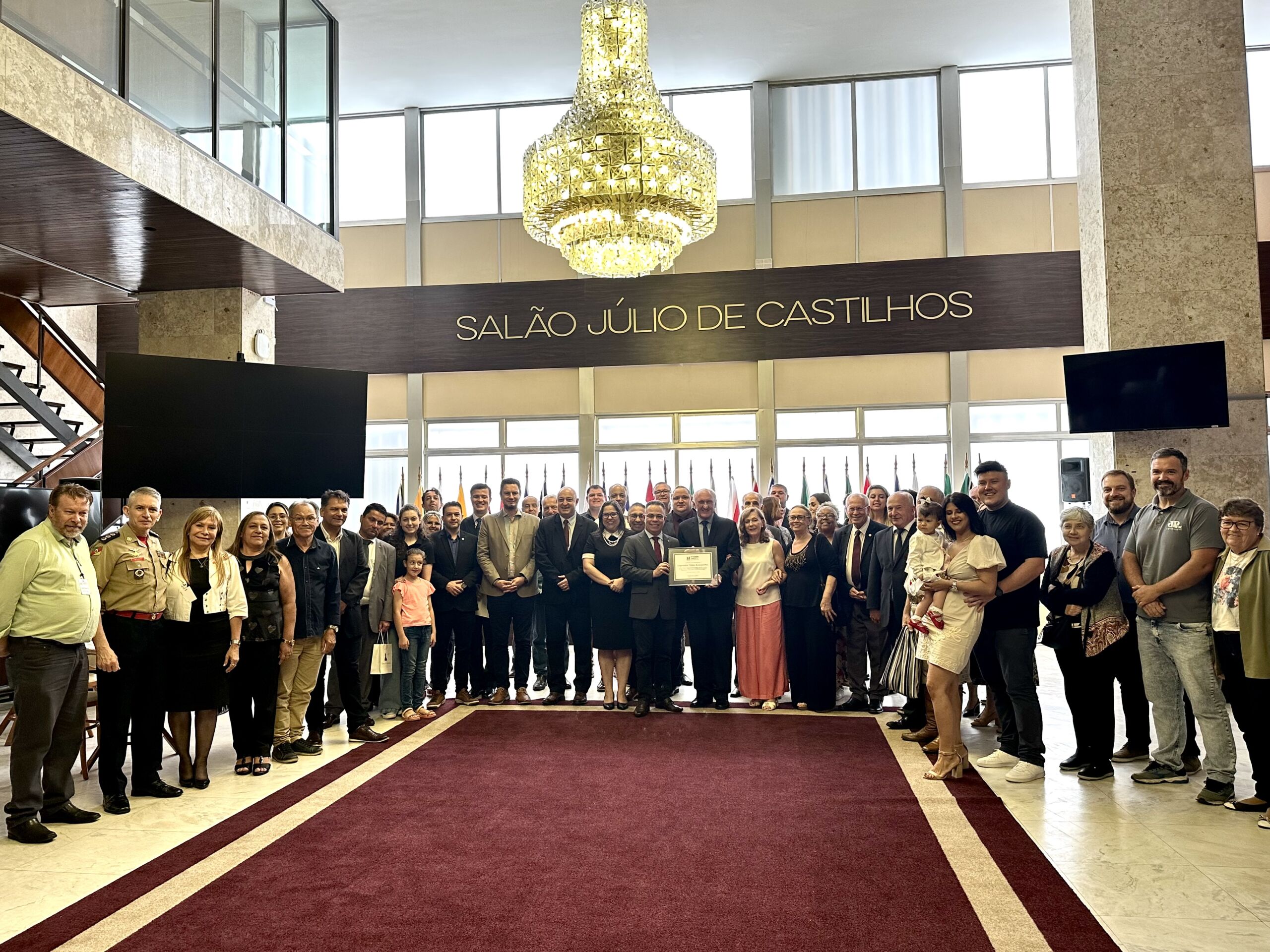 Nesta quarta-feira, 20 de dezembro, na última Sessão Plenária de 2023, no período do Grande Expediente, o deputado Sabino prestou homenagem ao empresárioHilário Krauspenhar, fundador da Rede Sky Hotéis, pelo fomento ao turismo e geração de empregos na região da Serra. Em seu pronunciamento, Sabino contou a história da Família Krauspenhar, que com muito esforço, dedicação e comprometimento, abriram 11 hotéis, restaurantes e spas, que compõem a Rede Sky.