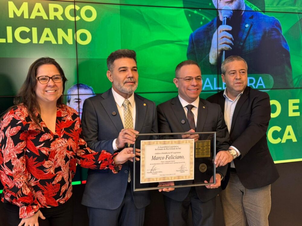 No último sábado, dia 1º de novembro, o Deputado Estadual Sabino realizou a entrega da Medalha do Mérito da 56ª Legislatura ao Pastor e Deputado Federal Marco Feliciano. A cerimônia foi realizada no Salão Júlio de Castilhos da Assembleia legislativa do Rio Grande do Sul.Durante o pronunciamento, o Deputado Sabino destacou que a homenagem é “justa, necessária e profundamente simbólica”, lembrando que o homenageado marcou o Brasil e o mundo “com sua fé, sua coragem e sua voz profética”.“Antes de ser político, Marco Feliciano é — e sempre será — um pregador do Evangelho. Com a Bíblia na mão e o coração cheio do Espírito Santo, percorreu o Brasil e mais de 100 países levando uma mensagem de fé, arrependimento e esperança”, afirmou Sabino, acrescentando que Feliciano influenciou uma geração de líderes e pregadores.O deputado também fez referência à ligação do homenageado com o Rio Grande do Sul, recordando sua amizade com o saudoso Pastor Luís Antônio da Luz, uma das vozes mais marcantes do movimento evangélico gaúcho. “Deus une pessoas e une propósitos”, afirmou Sabino, emocionado.Além de sua trajetória ministerial, Sabino ressaltou a atuação de Feliciano como um parlamentar convicto e corajoso, que “provou que o púlpito e a política podem caminhar juntos”. Ele enfatizou que o deputado federal “mostrou que é possível representar o povo sem se corromper, legislar sem perder a fé e lutar sem perder o amor”, tornando-se símbolo de coerência e lealdade aos princípios cristãos.O Pr. Marco Feliciano, agradeceu a homenagem, salientando que é a primeira vez que ele recebe uma homenagem em uma casa legislativa: “Sempre recebi homenagens na igreja, ou mesmo em meu escritório. Mas é a primeira vez que tenho a honra de receber esta homenagem em uma casa legislativa”, salientou Feliciano, enaltecendo a iniciativa do Deputado Sabino.Durante o ato solene, o Deputado Estadual Ronaldo Nogueira também fez uma deferência especial ao homenageado, reconhecendo sua contribuição histórica ao movimento cristão e ao Parlamento brasileiro.Após receber a medalha, Marco Feliciano proferiu a palestra “O Cristão e a Política”, em que abordou a importância de o cristão se manifestar e participar da vida pública. O deputado destacou que é fundamental que homens e mulheres de fé ocupem espaços de representação para “defender os valores da Igreja e garantir que princípios éticos e morais estejam presentes nas decisões do Parlamento”.